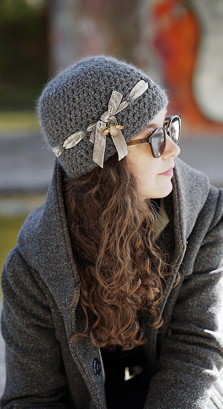 Die Häkelmütze ist aus reiner Wolle. Hübsch und dekorativ wirkt das eingezogene Samtband und die kleine Bienen-Brosche.