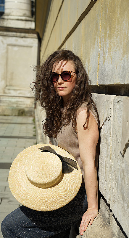 Florentin. Breitkrempiger Strohhut mit feiner Schleife. Der Hut sitzt ganz flach auf dem Kopf und ist dadurch schön luftig.